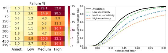 Comparison of prediction and human annotation under low, medium and high localization uncertainty ranges. Failure percentages are shown on the heat map where rows are the speed levels (still: no head motion label [0,1) pix/s, avg: average over levels excluding [0,1) pix/s). Cumulative distribution curves of the precision error are shown on the right where speed balancing is realized by sub-sampling without replacement equally from each speed interval.