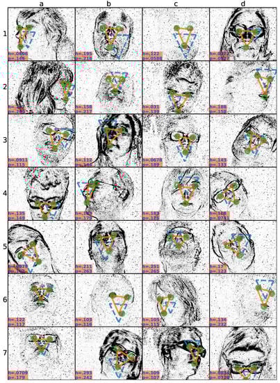 Snapshots of alignments at the high localization uncertainty setting. Each plot (a–d, 1–7) shows a different snapshot from a different subject, or head pose. At each snapshot ground-truth annotation (red dots), second human annotation (green circles), initialization (blue dashed triangular shape), and prediction (orange triangular shape) are overlaid. Inter-human disagreement (h) and prediction (p) errors are written at the left-bottom corners.