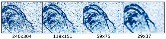 Pixel-event snapshots of 40 ms frame at different spatial scales while head is rotating (71.2 pix/s RMS speed). The scales from left to right are 1, , and , with pixel sizes written below.