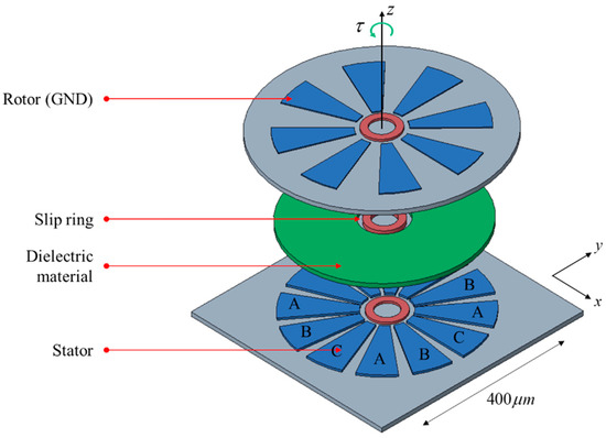 The rotor and stator are conducting electrodes. The rotor is electrically grounded, and input voltage is applied through the stator. The stator consists of 12 poles with three phases (A, B, and C.) The actuator can be driven using three-phase 12-pole electrostatic conversion.