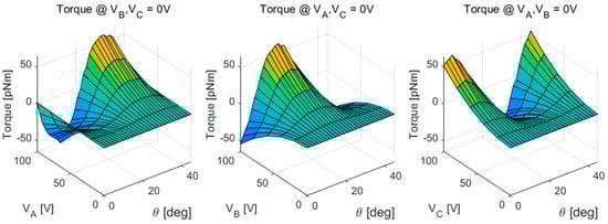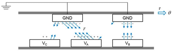 The most common way of modeling the force or torque generation is by deriving an equation based on a simple flat capacitor model. However, as mentioned, this top-drive electrostatic rotary actuator cannot be approximated by a simple flat capacitor. For a capacitor in which the electrode shape is not a plate, some methods have been proposed to derive an analytical model. For example, the electric field of a complex-shape capacitor has been analyzed using Schwarz–Christoffel mapping (SCM) [27,28,29,30]. However, these methods can only be applied when the capacitor consists of only two electrodes. There is no simple analytical model for a capacitor consisting of more than two electrodes.