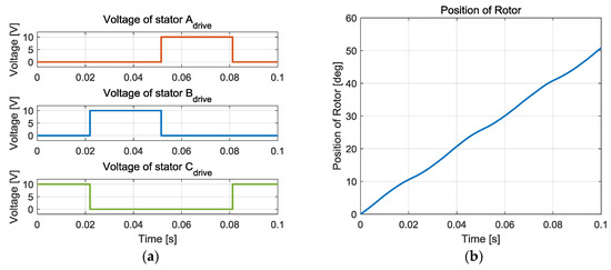 Figure 3 and Figure 4 show examples of actuator operations. The input voltage can be a simple PWM signal. To rotate the rotor in one direction without changing the sign of the angular velocity, the voltage should be supplied to one or two phases according to the angle because the sign of the electrostatic torque is determined by rotor position. Open-loop input with constant voltage results in increasing the angle, as shown in Figure 3, where the rotor velocity is not constant even for constant voltage input due to nonlinearity of the force generation of the capacitor.