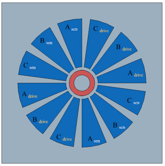To measure the capacitance, the RC circuit is configured by connecting a resistor to the stator [7]. In Figure 2, the amount of electric charge in an electrode depends on not only the voltage applied to the electrode but also the voltages of neighboring electrodes. Figure 6 presents a 2-D view of the cylindrical structure of the actuator. The capacitor-sensing system consists of three electrodes where excitation voltage inputs are applied as well as a resistor to measure the response voltage of the RC circuit. A resistor is attached to one of the three-phase stators, and the other phase is directly connected to the power supply.