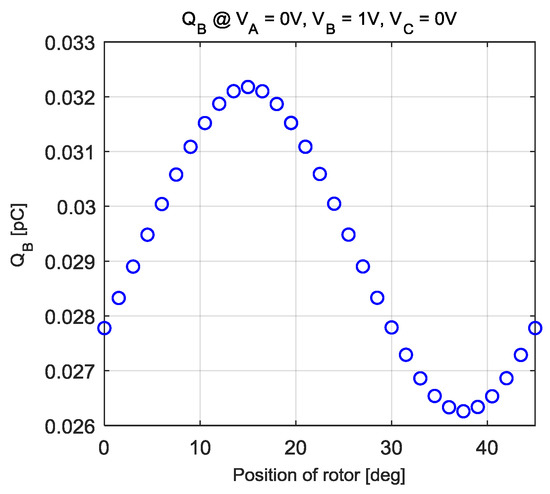 The capacitance model was derived in a similar way to the torque model derivation. Figure 10 and Figure 11 show some of the results from the COMSOL analysis. In both graphs in Figure 10, the electric charges are linear with respect to the voltage inputs. The electric charges can be expressed as a linear combination of the three voltage inputs VA, VB, and VC. Figure 11 presents the amount of electric charge as the rotor position increases, which is a periodic nonlinear function of the rotor position.