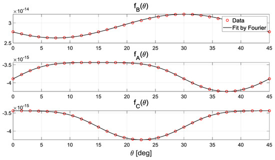 Therefore, fA(θ), fB(θ), and fC(θ) mean the differential capacitances. The model of the differential capacitance can be numerically derived from the function of QB. The function of the differential capacitance has a periodic form, so it is approximated using a Fourier series as follows.