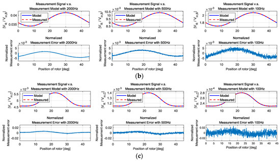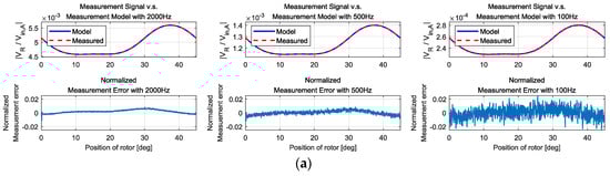 To confirm that the measurement model is valid and accurate, we performed a simulation and compared the measurement signal (the measured amplification ratio) with the evaluated value of the measurement model. Figure 14 shows the results. The measurement model shows high accuracy. The plot also shows the effect of high excitation frequency. The magnitude of the measurement changes according to the frequency. To compare the effect of the error with respect to the frequency, the normalized error is used. The normalized error is the value of error normalized by amplitude of the measurement signal. The higher the excitation frequency, the smaller the measurement error is. Another observation is that using the voltage response to vin,B would be beneficial because the signal magnitude is the biggest, which is beneficial for a large signal-to-noise ratio.