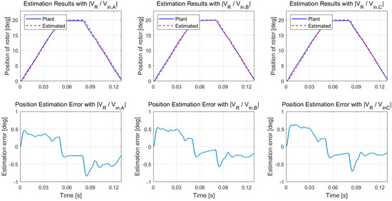 Figure 16 shows the results of position estimation using each measurement signal. The root mean square (RMS) error of the estimator was 0.4069 degrees when the magnitude responses of vR to vin,A were used as the measurement signal. The RMS error of the case with vR to vin,B was 0.3276 degrees. The RMS error of the case with vR to vin,C was 0.3658 degrees. These results are consistent with the discussion in Section 6.1. Therefore, the best location for the excitation would be the that of vin,B.