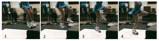 Force plate validation setup. Skaters performed drop landings from a box onto two force plates covered with HDPE artificial ice. Time progresses from left (1) to right (4).