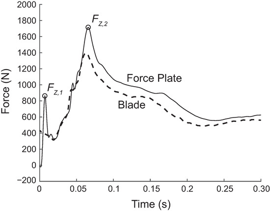 Comparison of forces measured by the force plate and the blade from a representative drop landing. The blade force was calibrated from ten drop/jump landings onto the force plate. The blade force and force plate force typically agreed in overall shape, but disagreed in the presence of the initial impact peak, , (usually present in the force plate force but not in the blade force), and the height of the second peak , (usually higher in the force plate force).