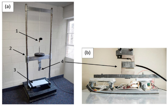 Load cell validation setup. To measure forces under controlled conditions, a drop tower (a) was used consisting of a weighted sled mounted on linear bearings (2); the sled was released from different heights using a mechanical archery caliper (1), falling onto a force plate covered by artificial ice (3). Attached to the sled was a load cell (4) and the instrumented blade (b).
