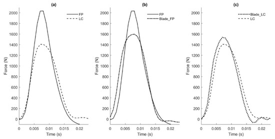 Comparison of force plate (FP) force, load cell (LC) force, blade force from FP calibration (BFP), and blade force from LC calibration (BLC) from one representative controlled drop trial. (a) FP and LC forces from the same drop trial, demonstrating the large difference between peak magnitudes; (b) FP and BFP forces, showing similarly large differences in peak magnitudes; (c) LC and BLC forces, showing better agreement in peak magnitudes.