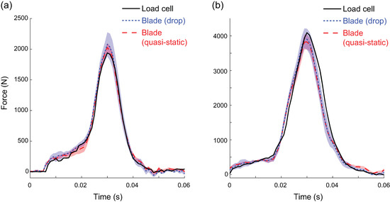 Blade and load cell (LC) forces from two representative drop trials—one with a low weight (a) and the other at a high weight (b). Blade forces were estimated using either Quasi-static (QS) or Drop (Drop) calibrations. Each of the nine calibration matrices created for each loading condition were applied to the blade data, resulting in nine estimates of force. The lines associated with blade data represent the means of these estimated forces, and the shaded areas represent the standard deviation of the nine estimates of force. In this example, the QS calibration was slightly more accurate on the low force trial and the Drop calibration was slightly more accurate on the higher force trial.