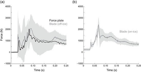 Drop-loading calibration applied to two example jumps. (a) Off-ice jump from a box onto a force plate. The blade force roughly matches the force plate force in timing and magnitude. (b) On-ice double flip jump, for which there is no force plate equivalent. The peak values are similar to the off-ice jump, but the initial toe contact peak is much smaller. The shaded areas represent the standard deviation of the force estimates calculated from the nine drop trial calibration matrices.