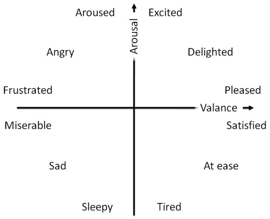 Russell’s valence–arousal scale is one of the most widely used scales [28]. In this scale, each psychological state is placed on a two-dimensional plane with arousal and valence as the vertical and horizontal axes. As it was depicted in Figure 1: