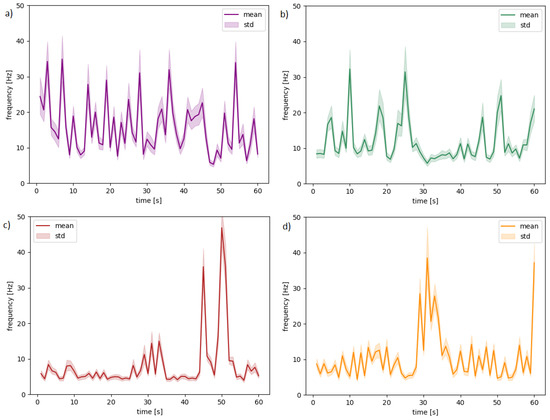 We propose choosing the commonly used mean statistics for every second of the recordings. The sample signal waveforms for four randomly selected subjects, videos, and channels are presented in Figure 4 to show the variability of the frequency values while watching a video. The solid lines in charts visualize the means, and light areas show standard deviation (variability between frequencies). Table 2 presents descriptions for each chart.