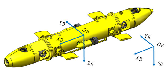 The AUV physical model is illustrated in Figure 1. The model is first introduced in [40] but only includes depth dynamics. To describe the dynamics of the AUV system, two frames of reference are introduced: the body-fixed frame and the Earth-fixed frame .