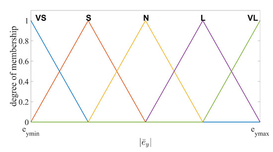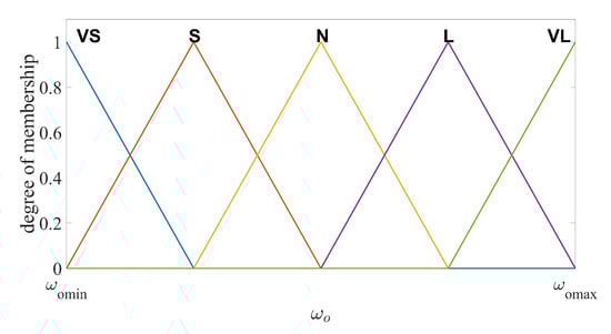 The membership functions (MFs) for and should be chosen to cover maximum and minimum values of the input and output range. In addition, the degree of the MFs corresponding to the maximum and minimum input/output values should be 1. In practice, the range of the output estimation error and the range of the observer bandwidth can be found through several experiments implemented by the LESO with fixed observer bandwidth. If the initial estimation error is too large, saturation functions can be used to limit the range. The values between the minimum and maximum are divided into five intervals equally for each MF. Several shapes of MFs are suitable for this fuzzy logic system, such as triangular, trapezoidal and bell-shaped functions [41]. Unified shapes of MFs have the advantages in computational efficiency, simple memory, easy analysis, etc. Thus, the unified triangular functions are chosen as the MFs for both input and output variables, as illustrated in Figure 2 and Figure 3. For system output, the centroid defuzzification method is adopted to convert the fuzzy language into observer bandwidth [42], formulated as