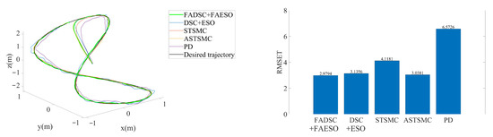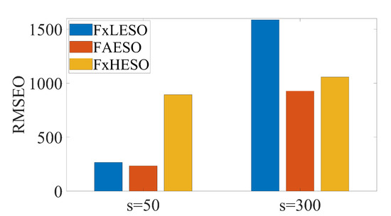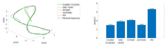 The simulation results are illustrated in Figure 16. It can be seen that the proposed method still outperforms the others. By comparing Figure 9, Figure 12 and Figure 16, it can be discovered that the RMSE values of the proposed method change little among the three scenarios. In contrast, the tracking accuracy of the DSC+ESO method without fuzzy adaptation degrades greatly as the conditions become more critical. This is a significant evidence of the benefits of fuzzy adaptation.