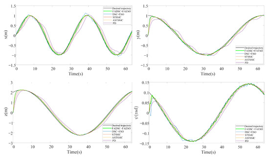 To verify the effectiveness and advantages of the proposed FAESO-based FADSC control scheme, the AUV system is assigned to perform a trajectory tracking task with a reference trajectory starting from . The desired trajectory is given as follows.