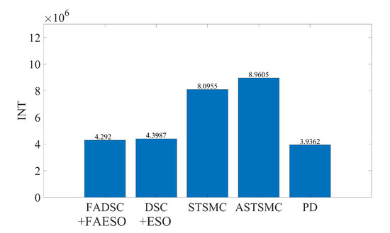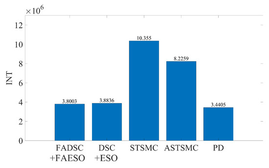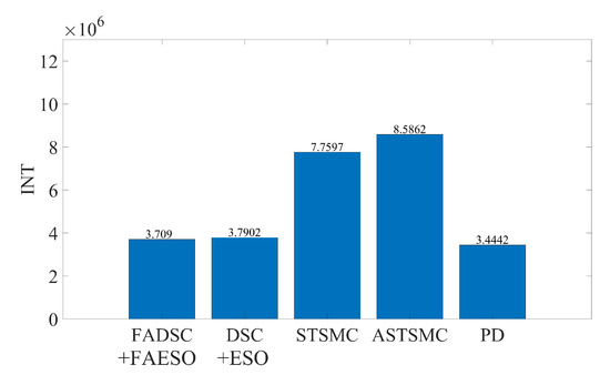 It can be seen from Figure 9 that the proposed control scheme (the solid green line) outperforms the other control schemes in the aspect of tracking accuracy. Among all the control methods, the PD controller performs the worst since it is not a robust method. The STSMC method shows its robustness disturbances to some extent, but higher energy consumption is required, seen in Figure 11. The introduction of adaptive law in ASTSMC indeed improves the performance, result in a better performance and less energy consumption. However, although the ASTSMC method has a similar performance in tracking accuracy and convergent rate as the proposed method, seen in Figure 10, the energy consumption is more than twice larger than the proposed method, as shown in Figure 11. The reason for this may be the influence of the measurement noise. Since the ASTSMC directly makes use of the state feedback error to calculate the adaptive law, the measurement noise may somehow exaggerate the controller gains. Differently, the fuzzy language is used to describe the state feedback error in the proposed method, which is not quite sensitive to noise. Compared with the original ESO-based DSC method, the proposed method also has improvements both in tracking accuracy and energy consumption. It is worth noting that the parameters used between DSC+ESO and the proposed method are all the same except the fuzzy logic part. Thus, it can be concluded that the incorporation of fuzzy logic system into the original DSC+ESO control scheme indeed increases the robustness of the entire system and reduces the effect of measurement noise.