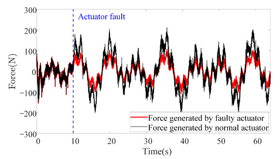 In this scenario, external disturbances, parameter uncertainties, actuator faults and measurement noises are all considered. This is a more critical and common scenario that is more likely to happen when the actuators collide or stuck with something in the real underwater environment. Although the actuator faults are not explicitly considered in the controller design process, the following simulation results still show that the proposed method is robust toward actuator faults to some extent. To make a horizontal comparison, the external disturbances and parameter uncertainties are set to the same configuration as those in Scenario 2. To simulate the actuator faults, one of the six actuators loses 50% of its power after the 10th second, as illustrated in Figure 15.