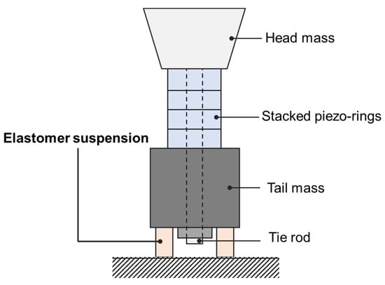 In a previous study, we introduced the concept of a fixed tail mass Tonpilz design to mitigate this design problem (Figure 1) [13]. In this design, an elastomer suspension supports a tail mass. Due to the spring constant of a suspension, an additional resonance vibration mode exists in addition to the longitudinal resonance mode of a Tonpilz. This rear-mounted Tonpilz projector generated an elastic fixture-induced whole-body oscillation mode below the longitudinal resonance frequency, which allowed dual-band operation of the transducer [14]. Although the low-frequency mode showed a noticeable lack of transmitting sensitivity (less than −20 dB compared to the longitudinal mode), our preliminary studies, however, showed the feasibility of utilizing such low-frequency resonance for a separate transmission mode. This preliminary study only showed a design concept with the simplified lumped model. Prior to prototyping and experimental validation, further analysis of transmitting characteristics and the effects of key design factors is required.