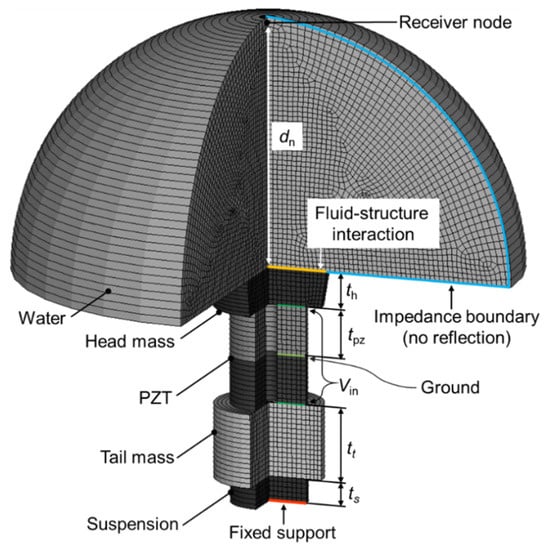 Figure 2 shows the created two-dimensional (2-D) axis-symmetric model of the transducer and water medium. The basic model has a dimension similar to that used in our preliminary works [13,14]. For simplicity, a tie-rod was removed and only two piezoceramic disks with opposite poling directions were stacked in the model. The averaged element size in the model was kept within 0.03λ, where λ is the wavelength at the longitudinal resonance frequency fL. The number of elements and nodes were 2023 and 2150, respectively. The head mass diameter was kept at 0.51λ. For harmonic analysis in the normalized frequency range of 0.1fL–2fL, 1 V was applied on the electrode layers designated as Vin. The bottom of the suspension layer was fixed by applying a zero-displacement condition on the nodes. The electrical resistance, reactance, and TVR spectra were all calculated. For the calculation of the TVR, a receiver node was set to read complex sound pressures at a distance approximately 1.07λ away in a far-field from the fluid–structure interaction layer. A full sound absorption (no reflection) condition was applied at the outer boundary of the water medium. The material properties and axial dimensions of each component are listed in Table 1 [17].