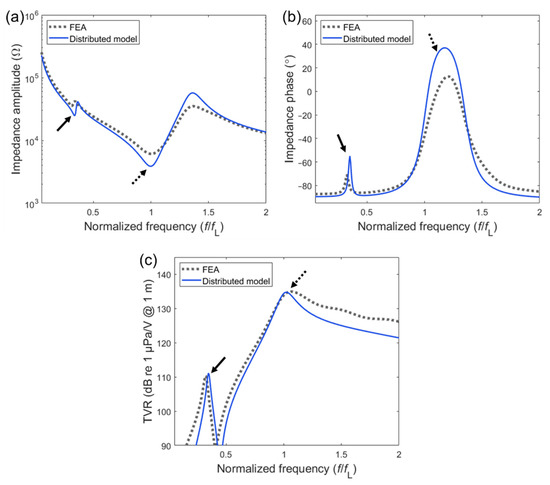 Equivalent circuit and finite element analysis (FEA) simulation of the electrical impedance and the transmitting voltage response (TVR) of the rear-mounted design: (a) impedance amplitude spectra; (b) impedance phase spectra; (c) TVR spectra. The suspension-induced peaks are marked by solid arrows while the fundamental resonance peaks are depicted by dotted arrows.