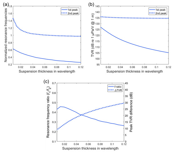 Based on the results in Figure 5a,b, we further investigated the variation trend of the resonance frequency ratio f1/f2, where f1 represents the first peak frequency and f2 represents the second peak frequency that is equal to fL in Section 2 and peak TVR difference (∆TVR) as shown in Figure 5c. The local maximum frequency ratio (f1/f2) was obtained as 0.46 when the suspension thickness was 0.013λ. The TVR difference indicates that a shorter suspension thickness (higher stiffness) is essential in reducing the TVR difference of the two resonance modes down to 9 dB.