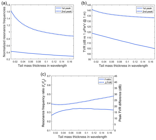 Transmitting characteristics as a function of the tail mass thickness. The thickness dimension is presented in wavelength and the frequency values are normalized by the fundamental longitudinal resonance frequency: (a) normalized resonance frequency variation; (b) TVR peak variation; (c) variation in resonance frequency ratio (f1/f2) and TVR difference.