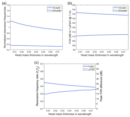 The aluminum head mass thickness was varied from 0.004λ to 0.077λ while the diameter was kept constant as 0.51λ. It should be noted that the distributed circuit model was used without considering the head mass flexural resonance mode since we focused on the TVR peaks and resonance frequency ratio instead of the bandwidth at the higher frequency band (>f2). The flexural resonance frequency highly depends on the head mass thickness, as shown in the approximated expression in Equation (3), where ch, th, Dh, and νh denote the wave speed, thickness, diameter, and Poisson’s ratio of the head mass, respectively [1]. The mode coupling with a flexural mode typically lowers the longitudinal resonance frequency (f2) [5,6].