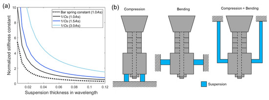 Material and design of a suspension: (a) effective stiffness as a function of suspension thickness. The larger cross-sectional areas (1.5As and 3.0As) yield higher stiffness; (b) suspension design examples (4-layer stacked piezo-element as an example). The same effective stiffness can be designed by adjusting the suspension structure and material.