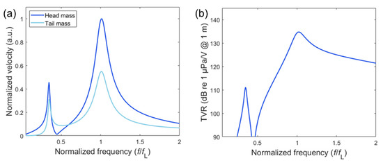 The velocity spectra of the head and tail mass also show special dynamic characteristics in comparison to the conventional Tonpilz transducers. For the basic model in Figure 2, the tail-to-head velocity ratios at f1 and f2 are 1.45 and 1.82, respectively, as shown in Figure 9a. This result is not in agreement with the prevalent relation (where uh and ut represent the velocity of the head and tail masses, respectively) for the conventional Tonpilz design [1], since the tail-to-head mass ratio of our basic model in this study is 4.77. The velocity ratio is much smaller than the mass ratio because of the effect of suspension, and this effect is more dominant at f1 than f2. Although the tail-to-head velocity ratio can be an important performance evaluation factor, the evaluation of TVR is essential because of the frequency-dependent radiation characteristic. The head mass velocity at f1 is 45% of that at f2, as shown in Figure 9a, whereas the TVR at f1 is −23 dB of that at f2, as shown in Figure 9b. This relationship is mainly due to the higher directivity index at a higher frequency, as explained by Equation (2). The overall TVR can be improved by using the multi-layered stacked piezo-elements rather than two layers, as was done in this study, while maintaining the total thickness [26]. For example, the same model with a four-layer piezo-element will generate approximately 6 dB higher TVR in the frequency range of interest compared to the TVR of the model with a two-layer piezo-element. As this constant TVR improvement is independent of frequency and the total thickness is the same, ∆TVR and the frequency ratio will not be strongly affected.