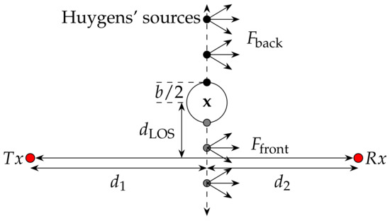 The knife-edge diffraction-based model calculates the effects of an obstacle on the received radio-frequency signal. Typically, we assume that the transmitter emits a wave in the far-field of the transmitter. The far-field for a center frequency of 4.5 GHz starts after approx. cm. Following the knife-edge diffraction, the wavefront does not penetrate an obstacle. Instead, at the edges, the wavefront resolves into Huygens’ sources that will form a new wavefront, which propagates to the receiver [21]. Figure 2 shows a typical scenario. For more details on this model, we refer to our previous publication in [18].