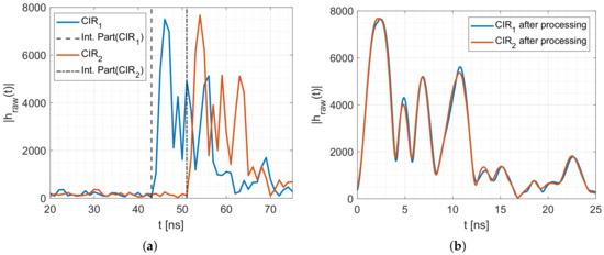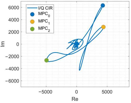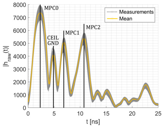 Figure 3 shows channel impulse response measurements with several distinguishable multipath components. The first peak indicated as MPC0 is the direct link between the transmitter and the receiver. Next to MPC0, we extract two additional MPCs (indicated as MPC1 and MPC2) that are caused by reflection on the wall from the CIR measurements. With the known positions of the MPCs in the CIR measurement, it is possible to extract the magnitude and the phase of the respective MPCs. In Section 4.2.3, we describe the extraction and processing of the MPCs from the CIR measurements in more detail.