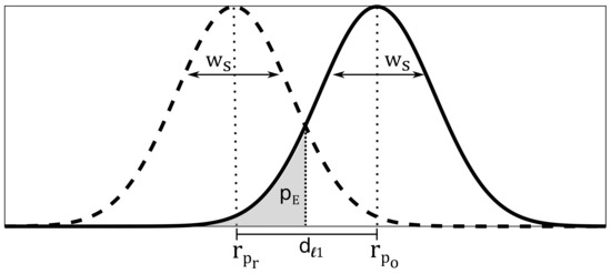 Figure 4 illustrates our proposed error model. The figure shows the probability density functions (PDFs) of the feature vectors and with elements, each. We assume that the probability density functions of the elements are normally distributed with the standard deviation of . The overall noise term for one feature vector is calculated as: