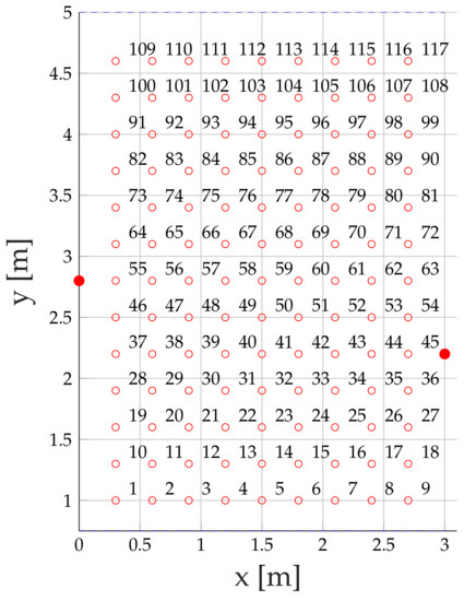 To simulate our device-free localization systems, we calculate the feature vectors for each position. The feature vector is composed of the different radio links of the setup. The impact on the magnitude is described with Equation (4), and the impact on the phase with Equation (5) respectively. For the conventional DFL system and the -MPC of the multipath-assisted DFL system, we insert the positions of the physical sensors. To calculate the MPCs, we superimpose the radio links of the virtual transmitter and the receiver and the virtual receiver and the transmitter .