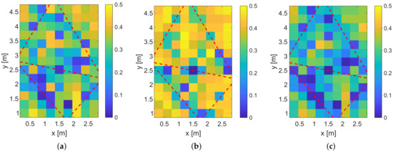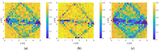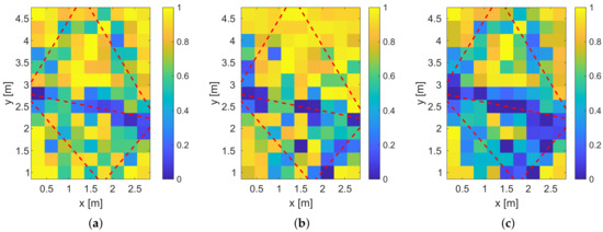 Figure 10a shows the position error probability based on the feature vector of the magnitudes of the MPCs. Close to the sensor positions and between the direct link between and , the position error probability is low. The corners of the rooms and the areas between the reflections and the direct link cannot be localized accurately.