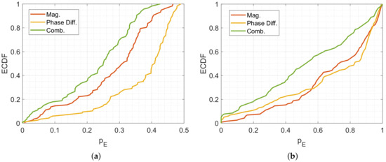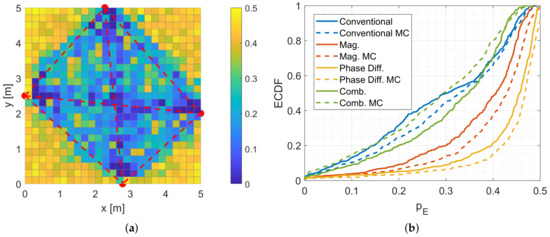Figure 16a shows the ECDF of the simulated . To compare the different systems numerically, we take a closer look at the percentage of the positions that have a position error probability lower than 0.25. For the systems that include only the phase differences is at approx. 15%, For the systems that include only the magnitudes is at approx. 35%, and for the systems that include the combination as a feature vector it is at approx. 50%.
