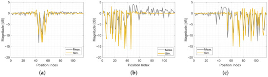 Measured and simulated magnitudes. (a) Simulated and measured . (b) Simulated and measured . (c) Simulated and measured .