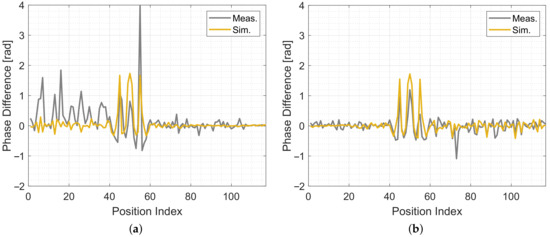 Measured and simulated phase differences. (a) Simulated and measured . (b) Simulated and measured .