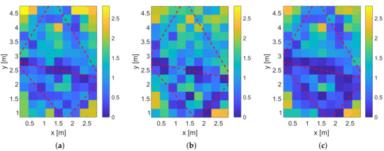 By comparing Figure 17a–c, the localization error close to the radio links is low. The corners of the target area cannot be localized reliably. Furthermore, we see that the areas in between the MPC0 and the other MPCs provide high localization errors because the person does not alternate the radio-frequency propagation as much as in direct proximity of the radio links.