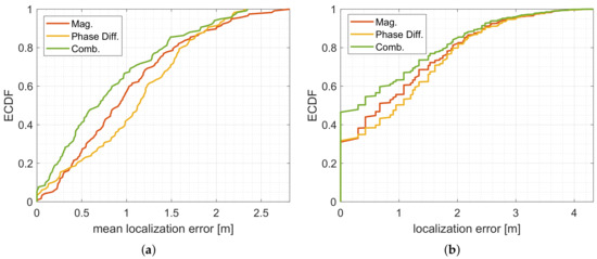 ECDFs for the measured localization error. (a) Mean of localization error determined by fingerprinting. (b) Localization error determined by fingerprinting.