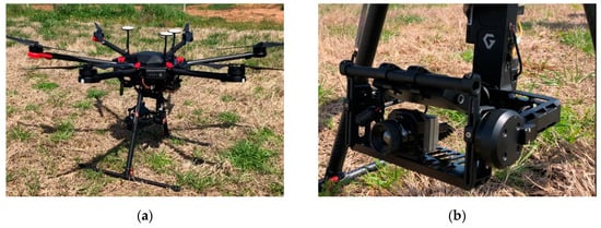 Thermal images were acquired using a rotary-wing UAV (Matrice 600 Pro, DJI, Guangdong, China; Figure 1), which was autonomously controlled along a predefined flight path with Pix4Dcapture mission planning software (Pix4D SA, Lausanne, Switzerland). The UAV has a maximum payload of 6 kg and was equipped with a thermal camera (ICI 8640 P-series, Infrared Cameras Inc., Beaumont, TX, USA) mounted on a three-axis gimbal to stabilize the images acquired during flight. The thermal camera produced 640 × 512 resolution images and was pre-calibrated by the manufacturer, and the temperature data were embedded in Celsius and Kelvin units in each pixel as calibrated temperature values of 16-bit and 32-bit tiff images, respectively.