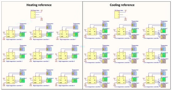 Both the temperature-controlled reference measurements were based on a 61 × 61 cm square aluminum plate. These were chosen to provide at least 40 pixels in the aerial thermal images when the camera was flown 40 m above the ground level (AGL). One reference served as a high-temperature reference and was equipped with temperature sensors, thermoelectric (TE) modules, and an integrated heating controller. The other reference served as a low-temperature reference and was equipped with temperature sensors, cooling fans, and an integrated cooling controller (Figure 2). Nine TE modules (Watronix, CA, USA) and nine temperature sensors (Droking, Guangdong, China) were uniformly distributed across both the references. To dissipate heat efficiently in the low-temperature reference panel, cooling fans (ARCTIC, Brunswick, Germany) were mounted atop each TE module. The circuit system comprised a heating reference circuit and a cooling reference circuit; its schematic diagram is shown in Figure 3. Nine high- and nine low-temperature microcontroller modules (Droking, Guangdong, China) were connected in parallel for both the high- and low-temperature references. The temperature sensors that produce continuous analog output signals were directly connected to analog channels of the microcontroller modules; the TE modules and cooling fans that connect to digital channels of the microcontroller modules were actuated with digital signal processing. The surface temperatures of both references were controlled with the nine microcontroller modules powered by a 12 V, 310 Ah rechargeable battery, based on a closed-loop temperature control method to accurately control and maintain temperature during the process (Figure 4). The control method, which is an efficient method for various industrial processes, contains a feedback loop in which the control system receives analog signals measured from the corresponding temperature sensors and develops a response to achieve temperature stability. The reference temperatures in the low and high reference controllers were set to 20 and 50 °C, respectively, based on the capacity of the battery to span the expected range of crop surface temperatures during the summer growing season.