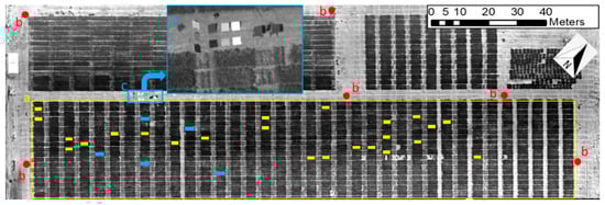 The effectiveness of the proposed temperature calibration method was evaluated by comparing the corrected and uncorrected thermal image mosaics with temperatures measured using a Handheld Infrared Radiometer (MI-220, Apogee Instruments Inc., Logan, UT, USA). The measurement targets included the aforementioned validation panels and the five randomly selected wheat plots from specific regions of interests (ROIs, solid blue blocks in Figure 5) in the test field. Temperature measurements of the five different sample locations in each plot were averaged immediately after UAV flight at solar noon on a clear sunny day and later compared to the corresponding sample averages for the calibrated and un-calibrated thermal image mosaics. The mean, root-mean-squared error (RMSE; Equation (1)), relative RMSE (Equation (2)), and RMSE improvement (Equation (3)) were calculated for each case.