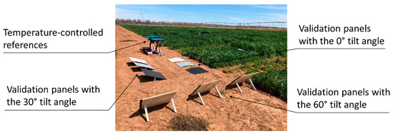 To investigate the benefit of calibrating the thermal image mosaic with field-based references, the temperature-controlled references, which were supported on metal stands, were placed on a flat road next to the test field (Figure 6). The temperature-controlled references were powered on 6 min before the UAV flight to achieve stable surface temperatures, and continuous power supply was maintained over the entire duration of the flight. Validation panels were installed next to the temperature references for comparisons between the ground-measured temperatures of the panels and those obtained from the temperature-corrected thermal image mosaics. These validation panels consisted of three sets of three-colored (light gray, 50% reflectance; medium gray, 25% reflectance; dark gray, 50% reflectance) square panels of dimensions 61 × 61 cm placed at three tilt angles (0, 30°, SE; 60°, NE) to impose temperature variations due to relative sun angles. Temperature calibration of the thermal image mosaic was implemented by (1) extracting the median pixel values from the high- and low-temperature references, (2) creating a linear equation to relate the pixel values to known temperatures of the references, and (3) calibrating all other pixels in the image mosaic with this equation.