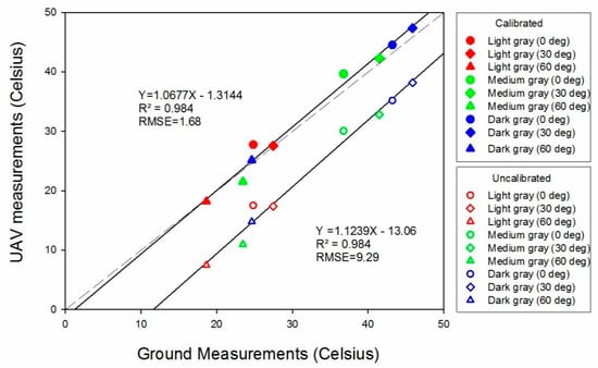 UAV thermal-image-based temperature estimates from both the un-calibrated and calibrated mosaics had strong linear relationships ( = 0.98) with ground measurements from the validation panels (Figure 8). Calibrating the data greatly reduced the RMSE values from 9.29 to 1.68 °C. Thus, the trend line from the calibrated data was much closer to the 1:1 ground-truth line (dotted line) than the un-calibrated trend line, as the IR transmission losses (scattering and diffusion) due to ambient and atmospheric effects were mitigated in the calibration process. Therefore, the proposed calibration method, based on the temperature-controlled references in the field, shows promise for greatly reducing the inherent errors of surface temperature data from aerial thermal images. As darker objects are known to absorb more thermal energy, the surface temperatures of the dark gray validation panels were highest, followed by those of the medium and light gray panels. Further, temperature values obtained from the panels with 60° tilt were the lowest among panels of the same color but with lesser tilts. However, the temperature values obtained from the panels with 30° tilt were higher than those from the 0° tilt. A likely reason for the low temperatures from panels with 60° tilt is that a lesser surface area was exposed to solar energy at the given solar angle. Furthermore, since the sun was not at the exact solar noon position at the time of the UAV flight, the panels with 30° tilt had relatively more surface area perpendicularly intercepting the radiation than panels at 0 or 60° tilt. These observations emphasize the effects of leaf angles on leaf temperatures; for example, leaves with vertical orientations are found to have lower surface temperatures [52,53]. Overall, the results of this test indicate that the proposed calibration method with temperature-controlled references can greatly improve surface temperature estimation, while caution should be exercised as to the orientation of the ground objects, such as individual leaf surfaces, because leaf angles and orientations have strong effects on temperature measurements.