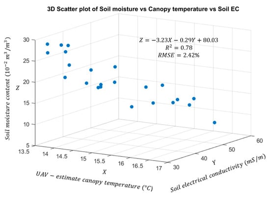 Multiple linear regression between the predictor variables (UAV-based canopy temperature and soil ECa) and soil moisture produced a good fit ( = 0.78; p-value < 0.001), suggesting good ability to estimate soil moisture content in the wheat field under study (Figure 9). A small amount of variation in the canopy temperature (13.8 to 16.7 °C) existed across the field because the crops grew under well-watered conditions, indicating that the value could be improved if the range of canopy temperatures across the field was greater, as may be encountered in non-irrigated conditions. Moreover, the multiple linear regression equation suggests that soil moisture content was negatively correlated with both canopy temperature and soil ECa, a finding that is consistent with results from other studies [65,66,67,68]. It was expected that a practical method for producing accurate canopy-temperature data across a field, which could be used for irrigation scheduling during the growing season, would enable estimating the soil moisture content with an acceptable level of accuracy (relative RMSE = 2.42%), if soil ECa data are practically available in farmland areas based on the proposed method of field-based calibration of UAV thermal images. It is notable that the canopy surface temperatures obtained from the UAV measurements were close to but lower than the low reference temperature of 20 °C, which was the lowest achievable temperature on the temperature-controlled references in the outdoor environment. Thus, further research must be conducted to improve the correlation and validate linearity between canopy surface temperature and soil properties by modifying the low-temperature reference to span the range of temperatures present in the field, for both summer and winter conditions.