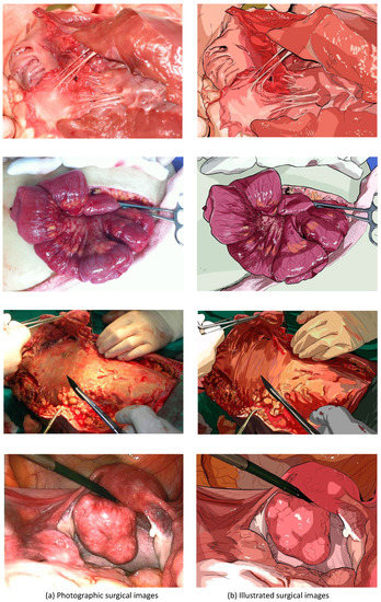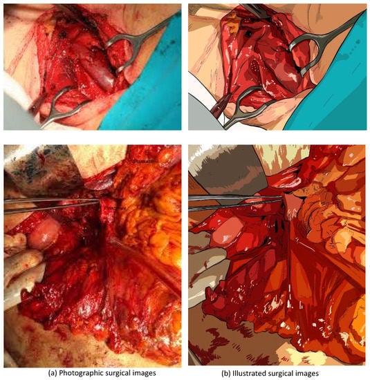 The limitation of this study is that we have not taken into account the opinions of experts, such as surgeons or pathologists in producing the illustrative surgical images. Surgeons may provide productive insights in the illustration of surgical images, for example, which fine details are important and must be kept. They may also be able to suggest proper colors to replace the original colors of flesh and blood.
